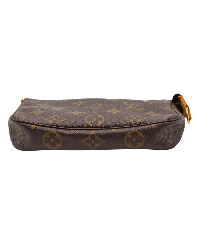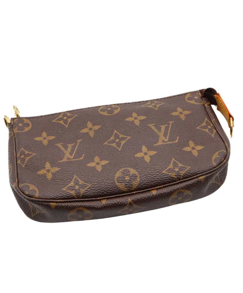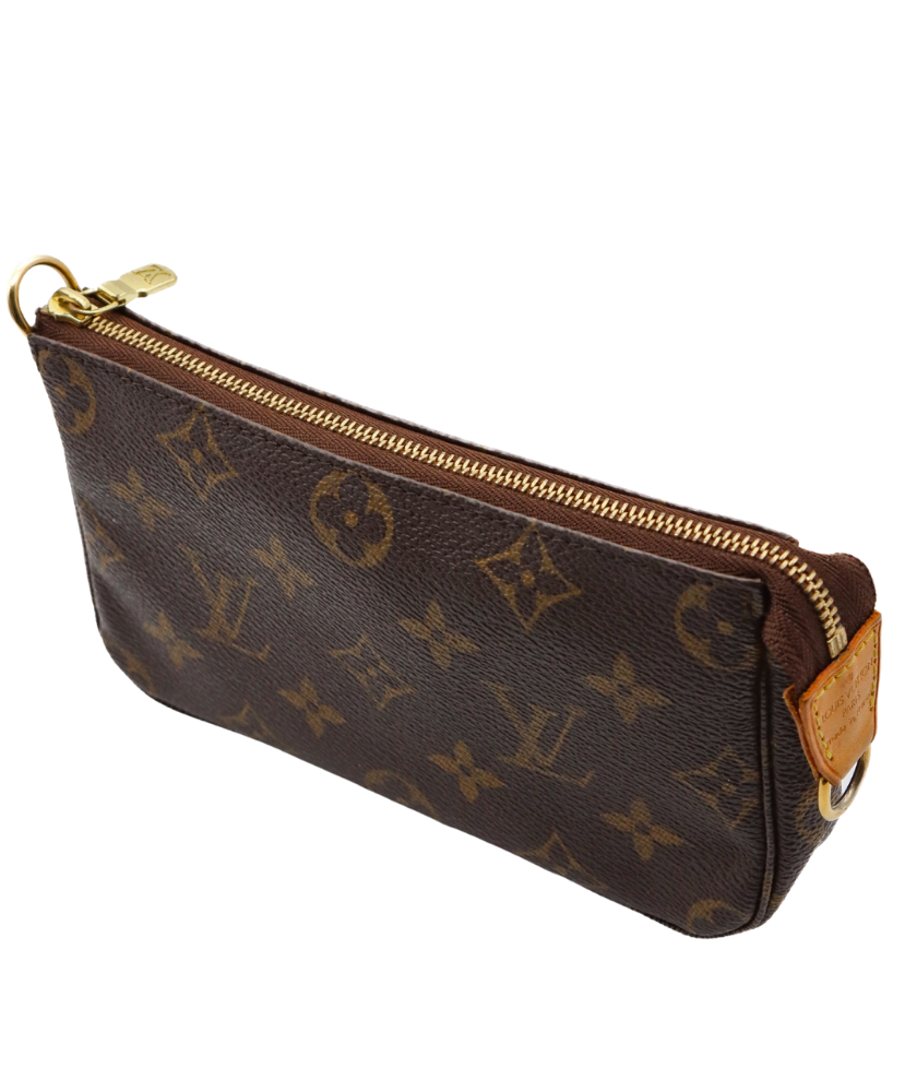 Finished with gold-tone hardware and a removable vachetta leather strap, this pochette can be worn as a small shoulder bag, wristlet, or used as an everyday organizer. The top zip closure opens to a brown fabric interior with a patch pocket, keeping your essentials secure and neatly stored.