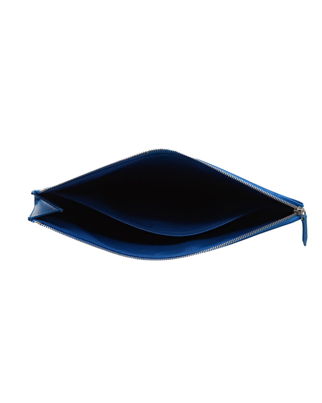 - Blue fabric-lined interior with flat pocket for organization