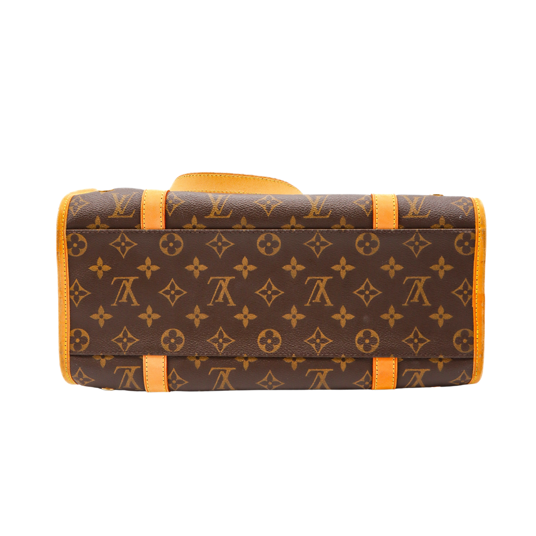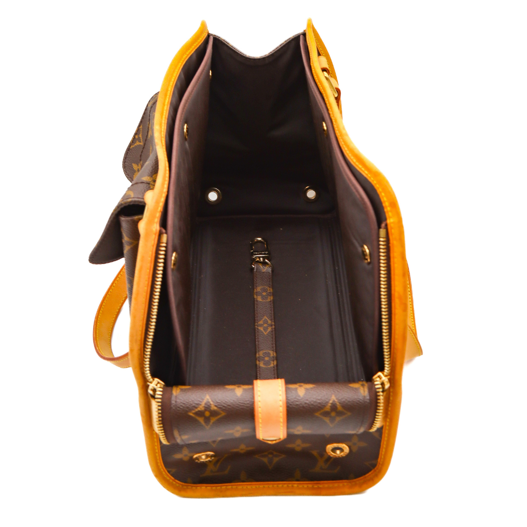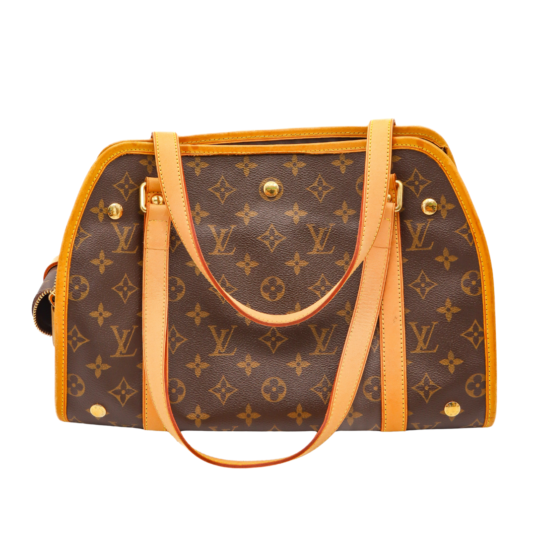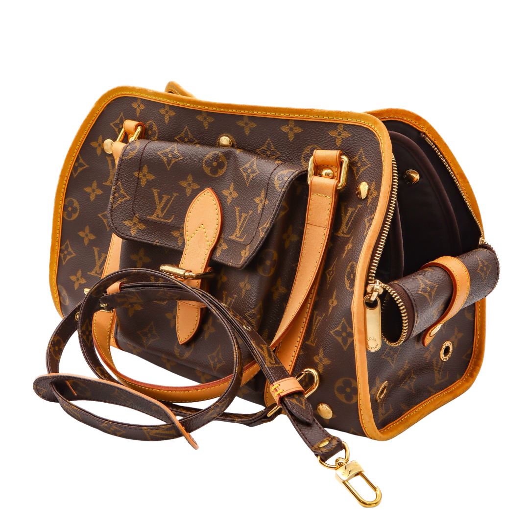 Crafted in signature Monogram canvas with vachetta leather trim, this carrier features comfortable rolled handles, polished brass hardware, and an exterior pocket for treats or tiny on-the-go essentials. The open-top design gives your pet room to peek out in style, while the interior is lined in durable brown fabric built for everyday use. Perfect for small dogs who appreciate the finer things in life.