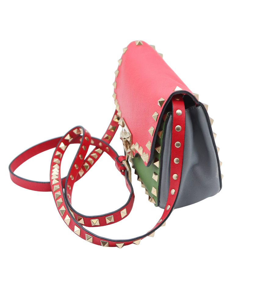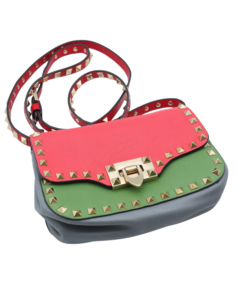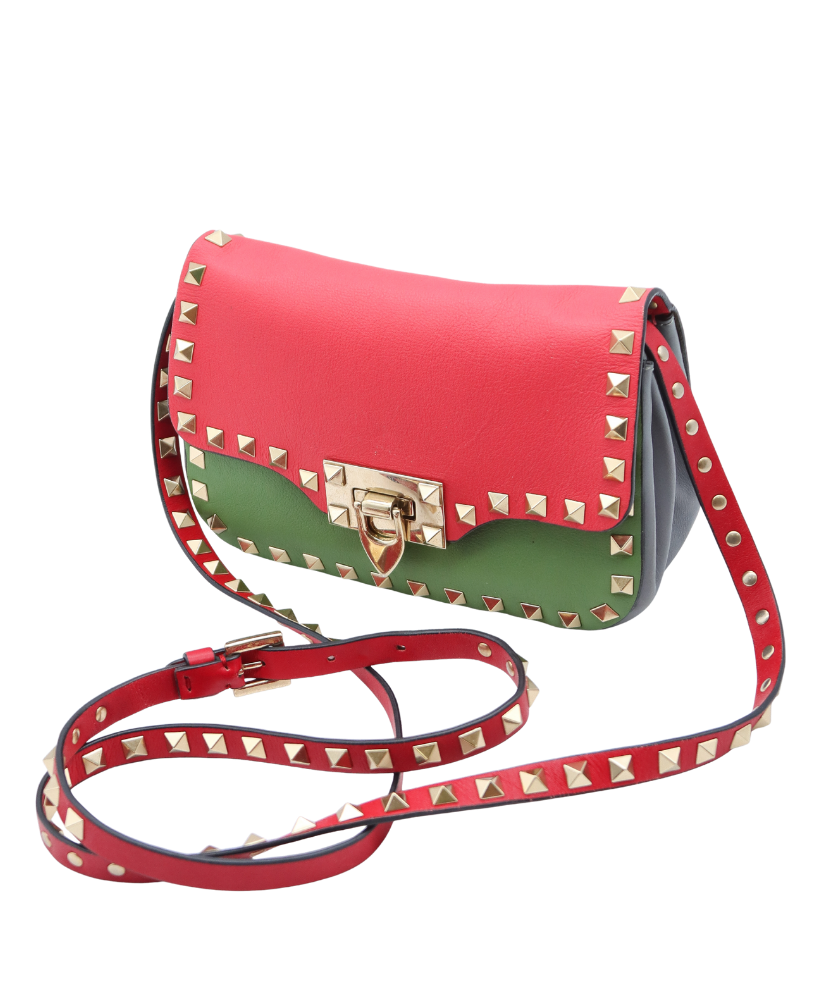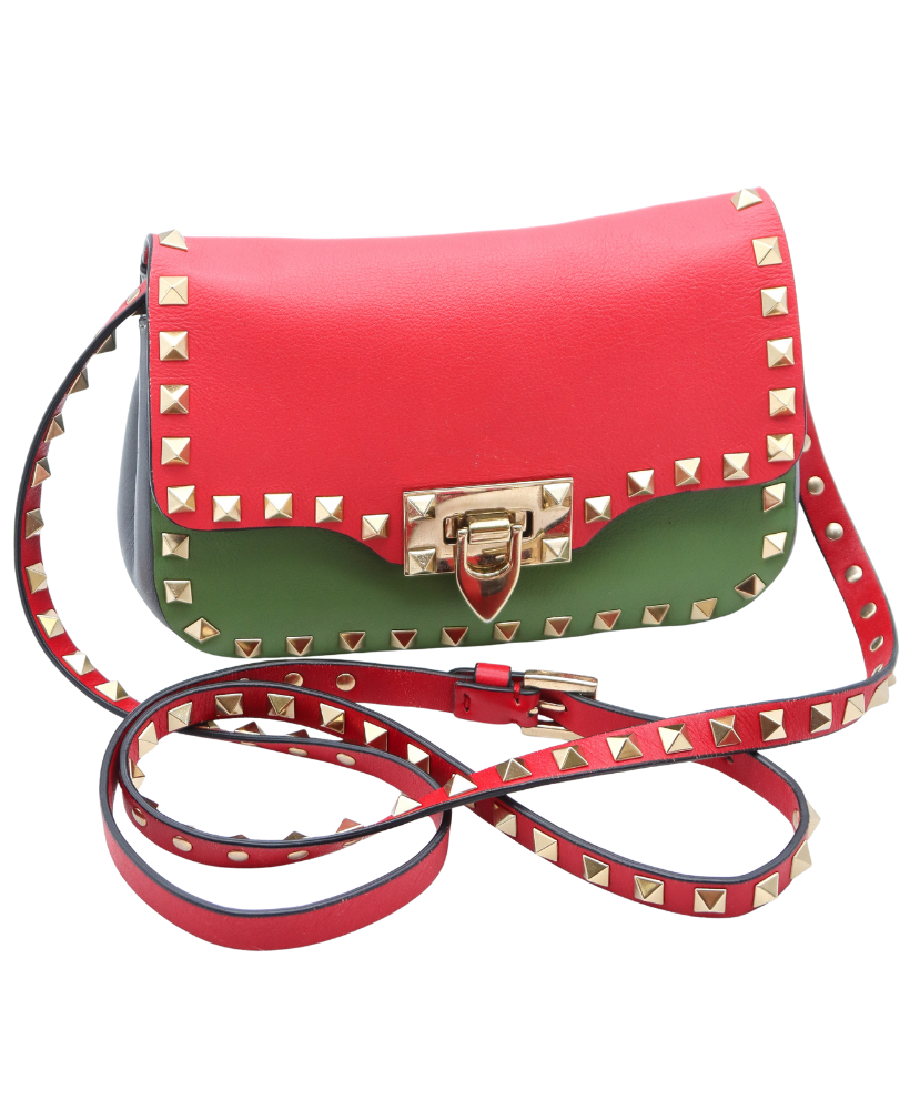 Bold, playful, and unmistakably Valentino, this Rockstud Lock Mini Crossbody makes a striking statement with its vibrant color-block design and iconic hardware. Crafted from smooth Vitello leather, the bag features a standout combination of red, green, and gray tones, accented with Valentino’s signature pyramid Rockstuds in light brass for a touch of edgy elegance.