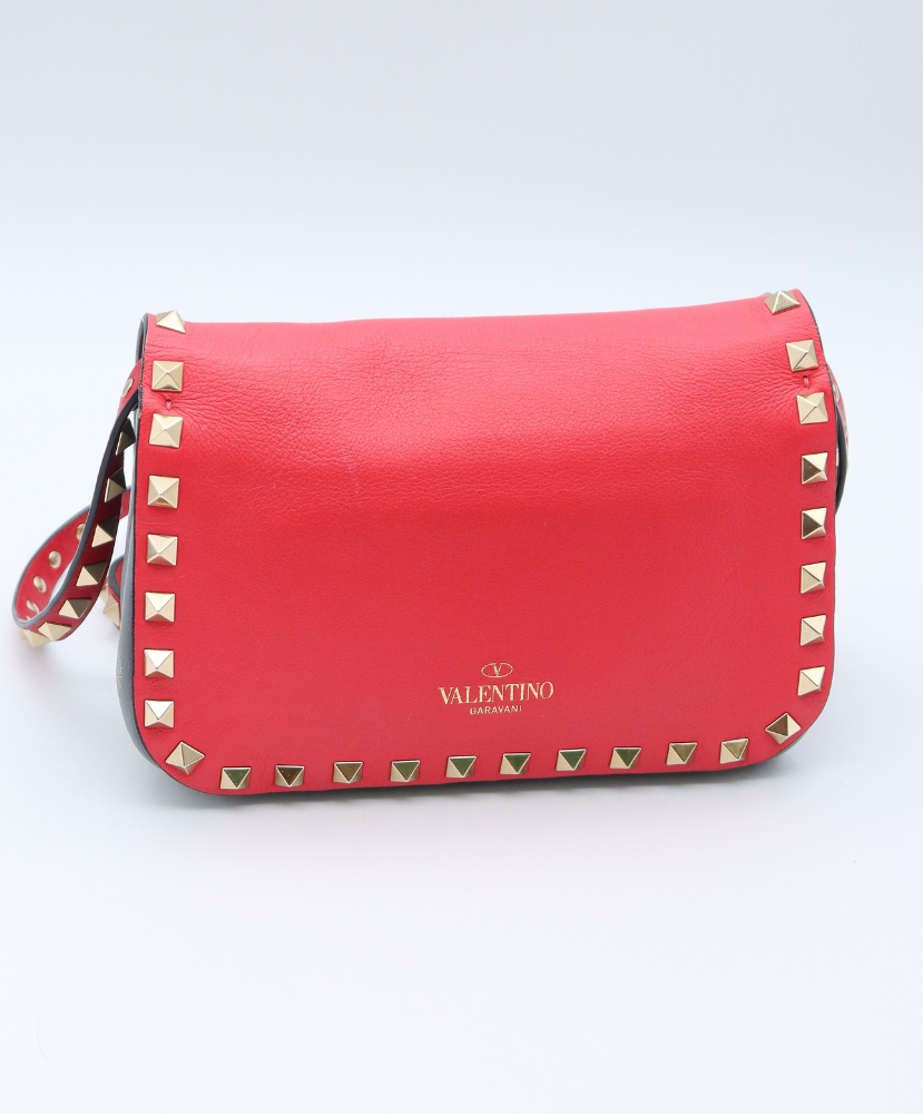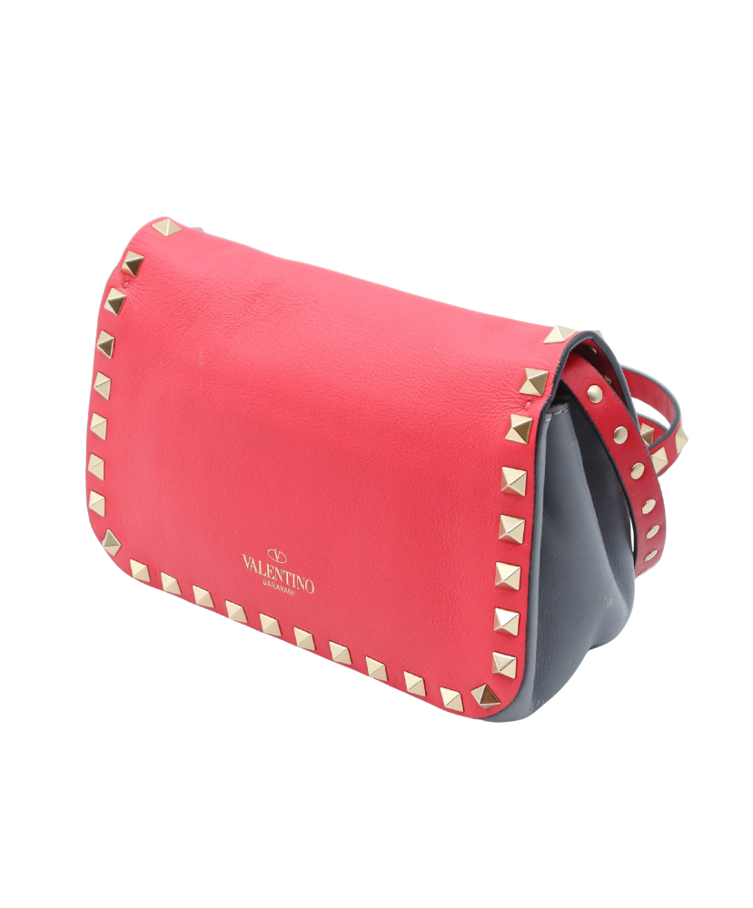 The structured flap silhouette is secured with a polished lock closure, opening to a compact yet functional interior ideal for essentials such as a phone, cardholder, keys, and lipstick. Finished with a matching Rockstud-embellished leather shoulder strap, this mini crossbody is perfect for hands-free wear, whether styled casually or as a statement accessory for day-to-night looks.